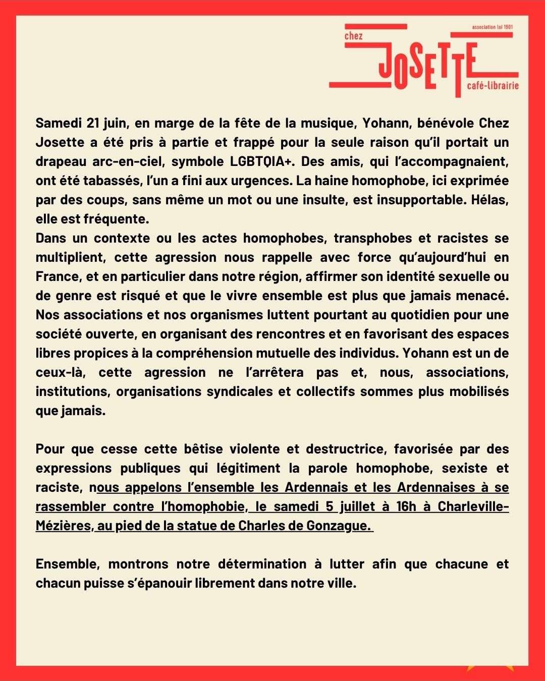 Suite à l’agression de Yohann samedi dernier en marge de la Fête de la Musique, frappé parce qu’il portait un drapeau arc-en-ciel symbole LGBT, un rassemblement aura lieu samedi prochain 5 juillet à Charleville-Mézières à partir de 16h au pied de la statue de Charles de Gonzague. Venez nombreux dire STOP à l’intolérance ! > Mois des fiertés 2025 – SNES-FSU