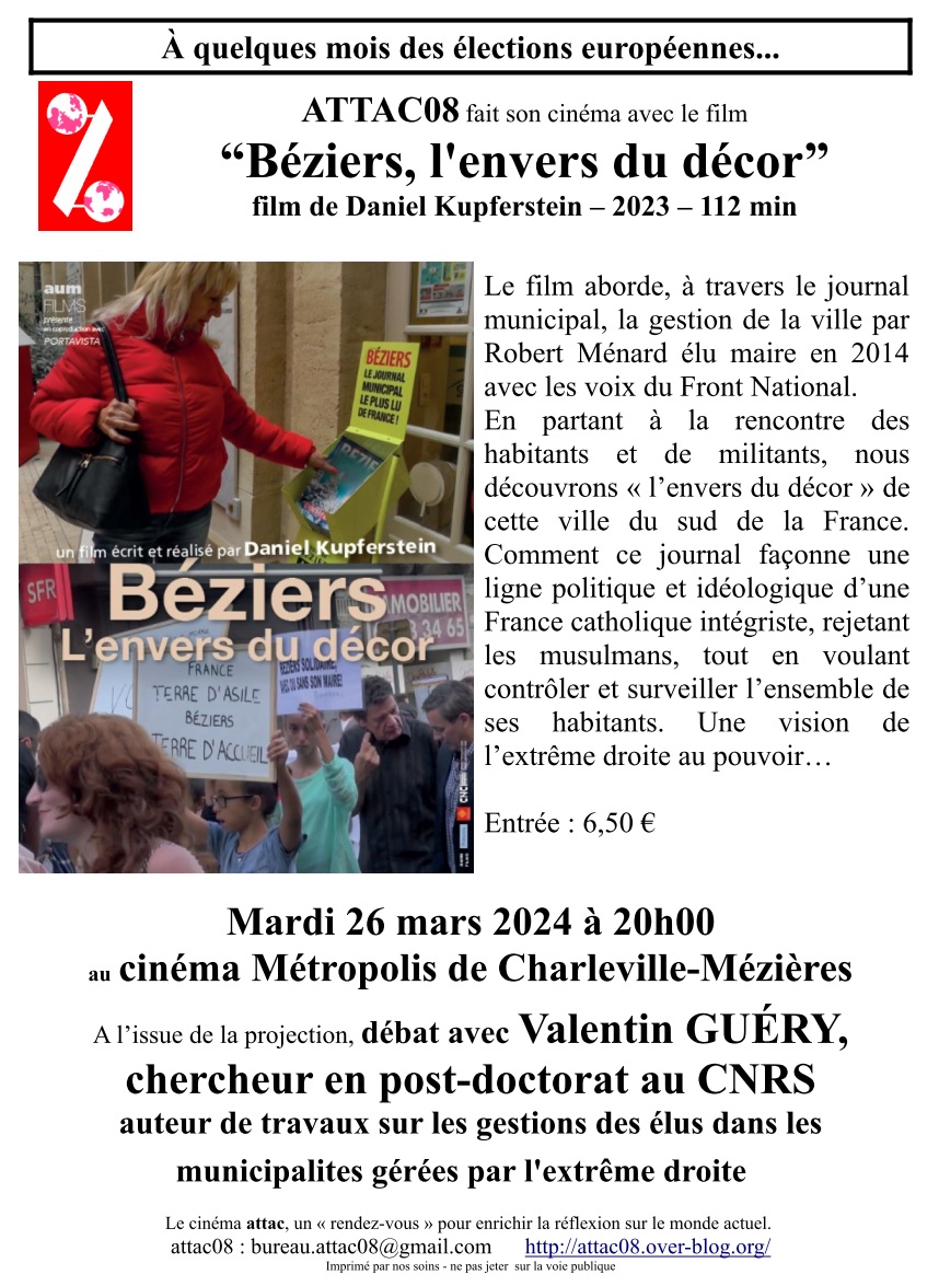 Attac08 organise son prochain ciné-débat le mardi 26 mars à 20 h au cinéma Métropolis de Charleville-Mézières.