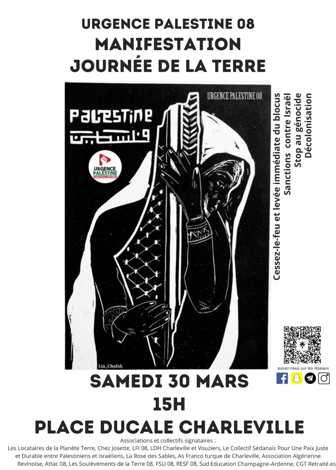 Dans la foulée de la dernière manifestation réussie, le collectif Urgence Palestine organise une marche pour la journée de la Terre en solidarité avec les civils Gaza et les réfugié.es palestinien.nes, avec les associations signataires de la dernière manifestation, ce samedi 30 mars 2024, 15 h Place Ducale.