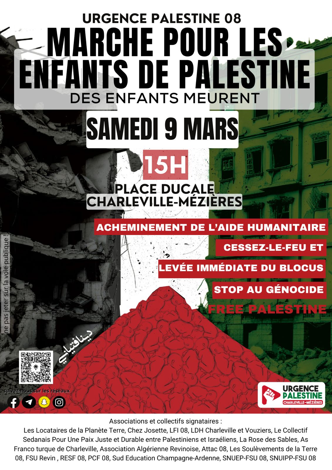 Manifestation soutien Palestine samedi 9 mars 2024-03-07T12:46:58+01:007 mars 2024|Catégories : À LA UNE|Mots-clés : ACTIONS| Rendez-vous 15h samedi 9 mars sur la place Ducale Partagez cet article ! FacebookXWhatsAppTelegramEmail Articles similaires [stage] L’Action Sociale au sein de l’Éducation Nationale ? : la connaitre et l’utiliser jeudi 30 avril 2026 à Charleville-Mézières [stage] L’Action Sociale au sein de l’Éducation Nationale ? : la connaitre et l’utiliser jeudi 30 avril 2026 à Charleville-Mézières 29 décembre 2025 [stage] Protection Sociale Complémentaire : les changements à venir et informations sur la santé en général jeudi 27 novembre Charleville-Mézières [stage] Protection Sociale Complémentaire : les changements à venir et informations sur la santé en général jeudi 27 novembre Charleville-Mézières 2 octobre 2025 [stage] Outrage, diffamation, dénonciation calomnieuse comment réagir ? jeudi 4 décembre Charleville-Mézières [stage] Outrage, diffamation, dénonciation calomnieuse comment réagir ? jeudi 4 décembre Charleville-Mézières 19 septembre 2025 [stage] Éducation et lutte contre les idées d’extrême droite [stage] Éducation et lutte contre les idées d’extrême droite 14 septembre 2025 Rassemblement en hommage à Mélanie, notre collègue tuée par un élève à Nogent Rassemblement en hommage à Mélanie, notre collègue tuée par un élève à Nogent 10 juin 2025