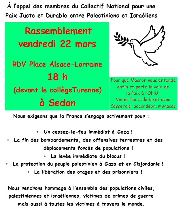 Manifestation soutien Palestine vendredi 22 mars 2024-03-22T08:10:44+01:0022 mars 2024|Catégories : À LA UNE|Mots-clés : ACTIONS| Rendez-vous 18h vendredi 22 mars place d’Alsace Lorraine de Sedan Partagez cet article ! FacebookXWhatsAppTelegramEmail Articles similaires [stage] L’Action Sociale au sein de l’Éducation Nationale ? : la connaitre et l’utiliser jeudi 30 avril 2026 à Charleville-Mézières [stage] L’Action Sociale au sein de l’Éducation Nationale ? : la connaitre et l’utiliser jeudi 30 avril 2026 à Charleville-Mézières 29 décembre 2025 [stage] Protection Sociale Complémentaire : les changements à venir et informations sur la santé en général jeudi 27 novembre Charleville-Mézières [stage] Protection Sociale Complémentaire : les changements à venir et informations sur la santé en général jeudi 27 novembre Charleville-Mézières 2 octobre 2025 [stage] Outrage, diffamation, dénonciation calomnieuse comment réagir ? jeudi 4 décembre Charleville-Mézières [stage] Outrage, diffamation, dénonciation calomnieuse comment réagir ? jeudi 4 décembre Charleville-Mézières 19 septembre 2025 [stage] Éducation et lutte contre les idées d’extrême droite [stage] Éducation et lutte contre les idées d’extrême droite 14 septembre 2025 Rassemblement en hommage à Mélanie, notre collègue tuée par un élève à Nogent Rassemblement en hommage à Mélanie, notre collègue tuée par un élève à Nogent 10 juin 2025