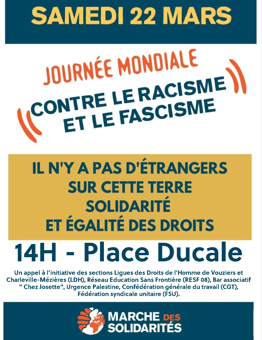 Né-e-s ici ou venu-e-s d’ailleurs, uni-e-s contre le racisme ! samedi 22 mars Place Ducale 2025-03-18T09:48:14+01:0016 mars 2025|Catégories : À LA UNE|Mots-clés : ACTIONS| Manifestons ensemble ce samedi 22 mars 2025 pour la journée internationale contre le racisme. Dans les Ardennes rendez-vous à 14h Place Ducale pour une manifestation jusqu’à la Préfecture pour y afficher nos messages au gouvernement ! Partagez cet article ! FacebookXWhatsAppTelegramEmail Articles similaires [stage] L’Action Sociale au sein de l’Éducation Nationale ? : la connaitre et l’utiliser jeudi 30 avril 2026 à Charleville-Mézières [stage] L’Action Sociale au sein de l’Éducation Nationale ? : la connaitre et l’utiliser jeudi 30 avril 2026 à Charleville-Mézières 29 décembre 2025 [stage] Protection Sociale Complémentaire : les changements à venir et informations sur la santé en général jeudi 27 novembre Charleville-Mézières [stage] Protection Sociale Complémentaire : les changements à venir et informations sur la santé en général jeudi 27 novembre Charleville-Mézières 2 octobre 2025 [stage] Outrage, diffamation, dénonciation calomnieuse comment réagir ? jeudi 4 décembre Charleville-Mézières [stage] Outrage, diffamation, dénonciation calomnieuse comment réagir ? jeudi 4 décembre Charleville-Mézières 19 septembre 2025 [stage] Éducation et lutte contre les idées d’extrême droite [stage] Éducation et lutte contre les idées d’extrême droite 14 septembre 2025 Rassemblement en hommage à Mélanie, notre collègue tuée par un élève à Nogent Rassemblement en hommage à Mélanie, notre collègue tuée par un élève à Nogent 10 juin 2025